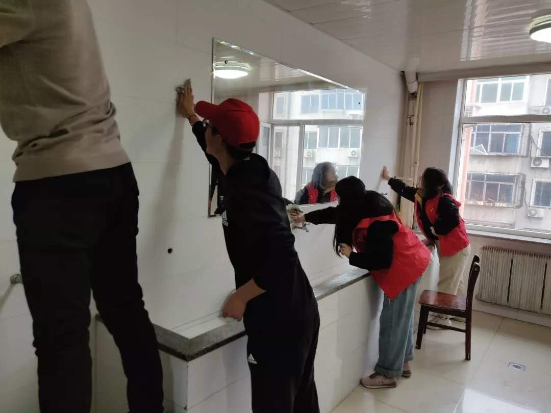 随后,为了让老人们有一个更舒适更干净的生活环境,志愿者们分成两组清理福利院楼道和水房,每个人都秉承着一颗服务的心挥洒着汗水。