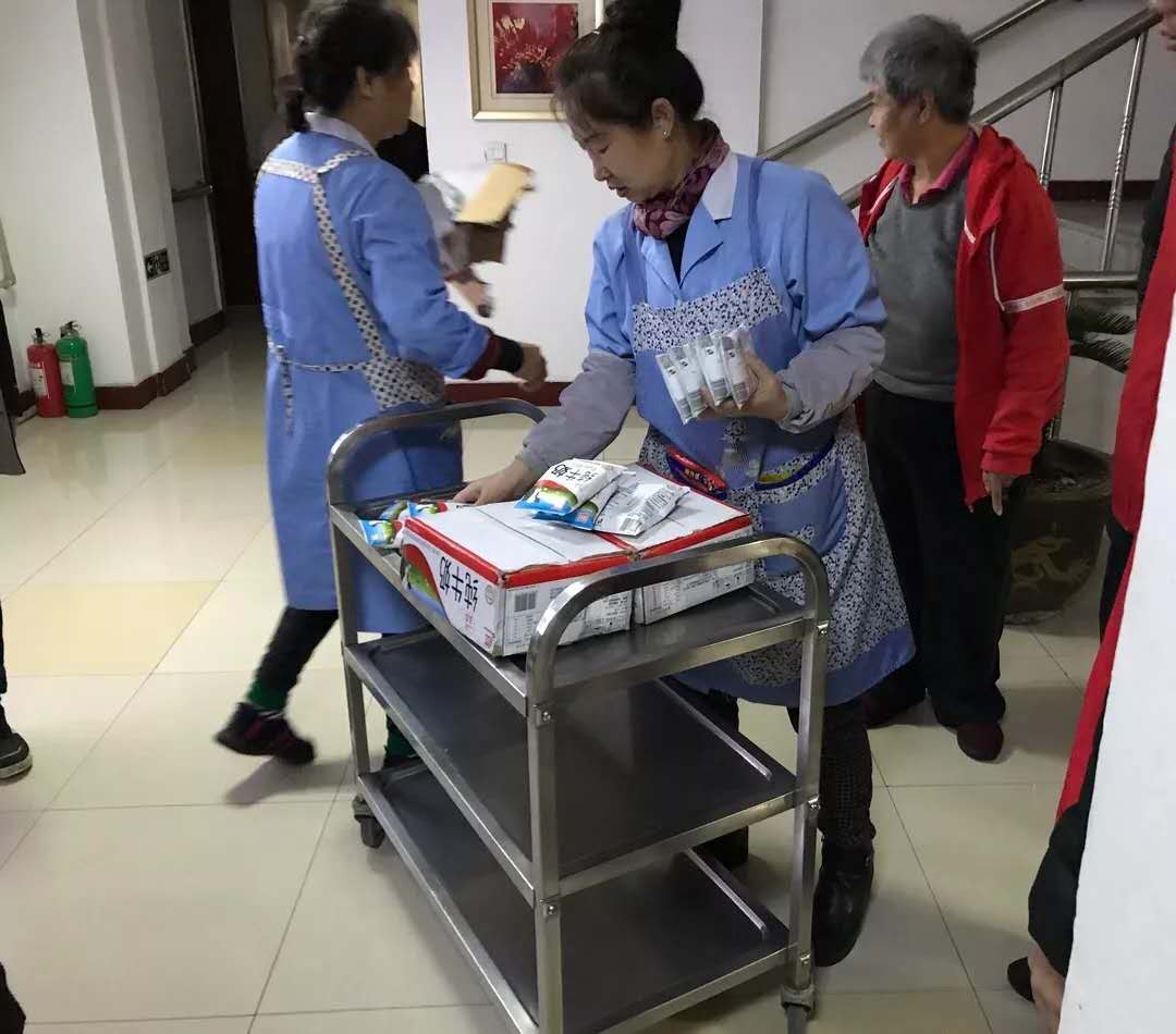 志愿者们在护工阿姨的引导下,将带来的牛奶分送给福利院的老人们,并围坐在老人的身边与他们聊起了生活日常,在交谈的过程中,许多和蔼的老人都露出灿烂的笑容,这让志愿者们感到温暖又舒心。
