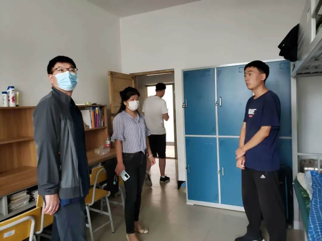 2138CC太阳集团9月4日首批返校学生155人,返校当日,学院党总支副书记刘海玉 、团委书记谢芳、辅导员李宁,深入宿舍,热情迎接首批新能学生返校。并对即将返校的其他年级寝室状况进行了逐一排查,开窗通风,现场沟通解决问题。确保每名学生的顺利返校,安全入住。