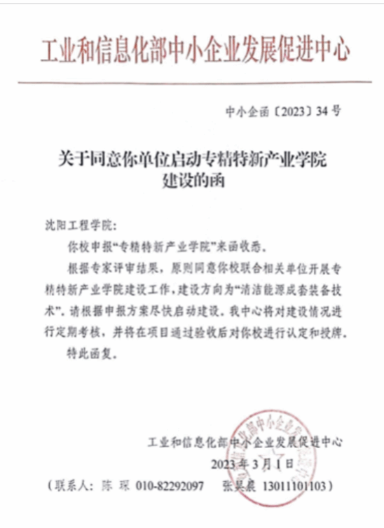 我院高庆忠院长牵头联合相关单位在我校开展以“清洁能源成套装备技术”为建设方向的专精特新产业学院建设工作,并于2023年3月正式获得工业和信息化部中小企业发展促进中心的批准。