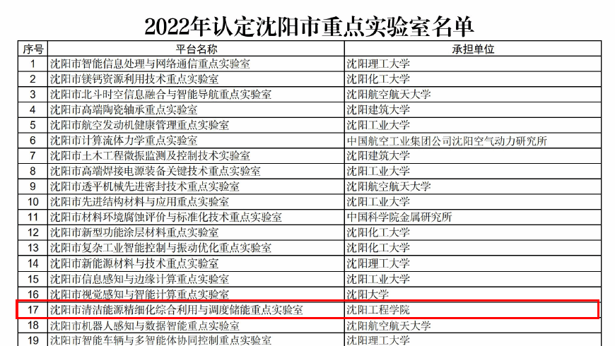 2022年12月我院副院长王帅杰牵头申报并经沈阳科技局认定获批“沈阳市清洁能源精细化综合利用与调度储能重点实验室”。实验室将以核心科技为基础,引进、融合、创新为发展路径,汇集市内一流专家学者及企业家,构筑产学研合作平台,打造产学研深度融合的协同创新体系。