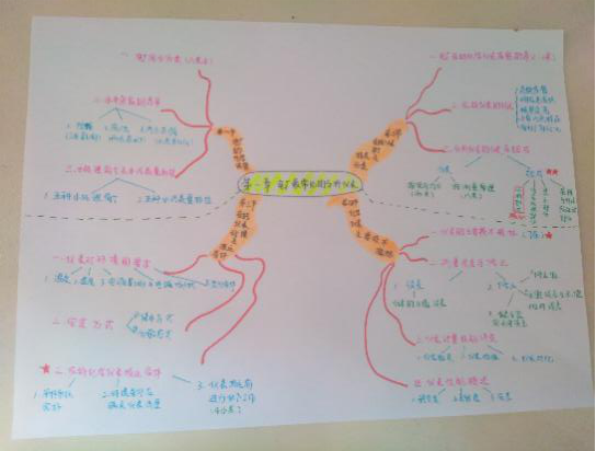 教学手段上,让学生自主复习绘制思维导图,生本互动。学生通过不同的软件或者通过手绘方式,每一章结束集中展示学习成果。