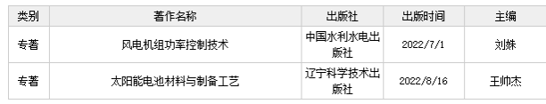 2022年我院两位教师出版专著两本。其中刘姝老师在《中国水利水电出版社》出版专著名称为《风电机组功率控制技术》,王帅杰老师在《辽宁科学技术出版社》出版专著名称为《太阳能电池材料与制备工艺》。