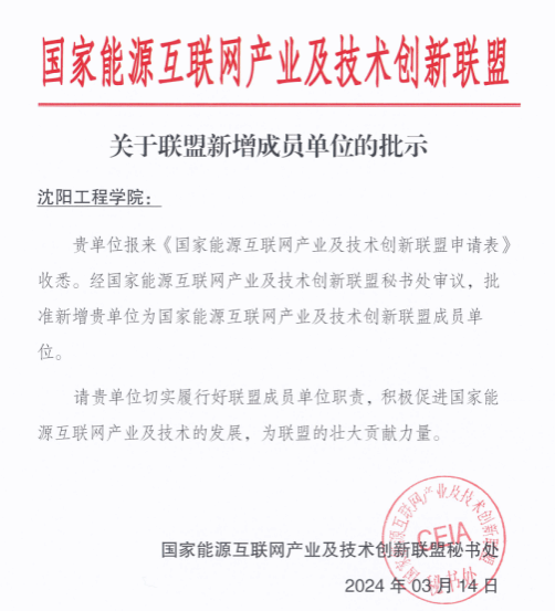 2024年3月,经国家能源互联网产业及技术创新联盟秘书处审议,我院获批成为国家能源互联网产业及技术创新联盟成员单位。此次获批,有助于学院提升科研实力,培养更多具备创新精神和实践能力的优秀人才,进一步推动学院与企业产业间产学研合作,帮助学院将科研成果转化为实际应用,为社会创造更多价值。