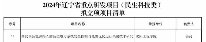 近日,辽宁省科学技术厅对2024年辽宁省重点研发项目拟立项项目进行公示,我院姜河老师主持的“高比例新能源接入的新型电力系统安全控制与低碳优化运行关键技术研究”项目拟立项民生科技类项目。